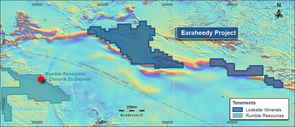 Map of Lodestar tenements in relation to Rumble Resources with a magnetic geophysical background showing the Frere Formation as a magnetic high (red).